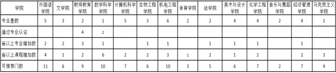 (一)根据各学院专业、课程建设情况限定推荐课程门数。按每个专业1门为基数(马克思主义学院可推荐基数为1门),通过专业认证专业增加2门推荐名额,国家级专业、课程增加2门推荐名额,省级专业、课程增加1门推荐名额,同一专业、课程取最高等级,不重复计算。请各教学单位根据要求认真规范做好组织推荐、评议评审等工作。