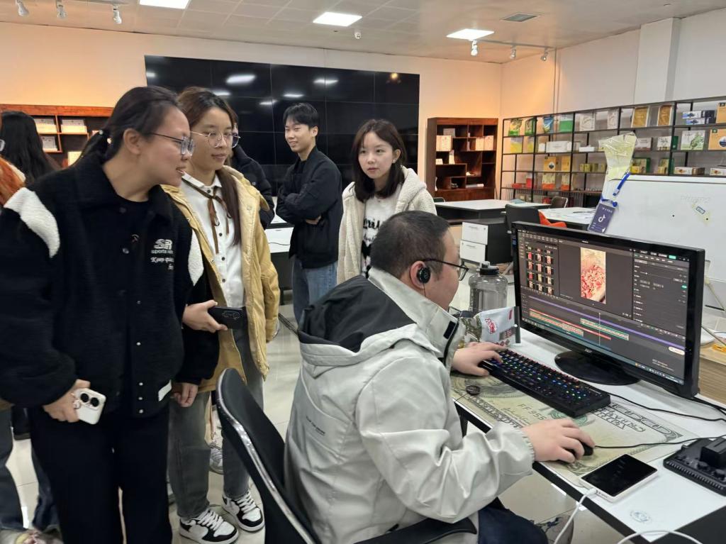 学生们不仅观看了直播设备、现代化的拍摄间和琳琅满目的商品展示台,还通过工作人员的讲解,了解了直播背后的技术支持和运营策略。此外,学生们还进行了模拟销售,周玉负责人对学生进行现场指导。