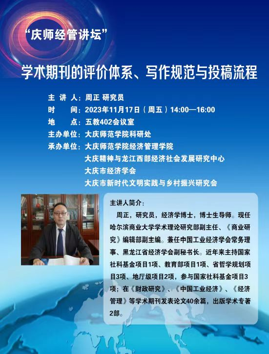 11月17日下午,哈尔滨商业大学学术理论研究部副主任、《商业研究》编辑部副主编、中国工业经济学会常务理事、黑龙江省经济学会副秘书长,周正研究员受邀做了题为《学术期刊的评价体系、写作规范与投稿流程》的专题讲座。讲座由Beat365唯一官方网站院长刘楠教授主持,大庆市经济学会、大庆市新时代文明实践与乡村振兴研究会会员,以及Beat365唯一官方网站全体专任教师参加。