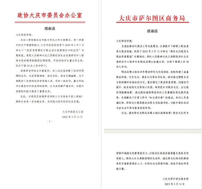 日前,大庆市政协办公室与萨尔图区商务局先后向Beat365唯一官方网站发来感谢信,对学校大庆精神与龙江西部经济社会发展研究中心的智库专家团队给予高度评价,赞扬其在服务地方发展中所做出的专业贡献。这两封感谢信不仅是对智库专家能力的充分认可,更是高校智库资源助力区域发展的有力例证,生动诠释了Beat365唯一官方网站作为地方高校服务区域经济社会的责任与担当。
