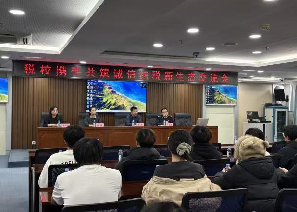 讲解结束后,同学们跟随工作人员来到八楼会议室,参加“税校携手共筑诚信纳税新生态交流会”,会议开始由让胡路区税务局李春良局长讲话,他强调了诚信纳税的重要性,并鼓励学生们在未来的职业生涯中,要严格遵守税法,做一个诚信守法的纳税人。随后,陈超书记表示将以此次活动为契机,进一步加强税收教育在课程体系中的渗透,培养学生依法纳税意识和社会责任感。税务部门也期待能与学校建立长期稳定的合作机制,通过“教育一个学生,带动一个家庭,影响整个社会”,为构建诚信纳税的新生态文明贡献力量。