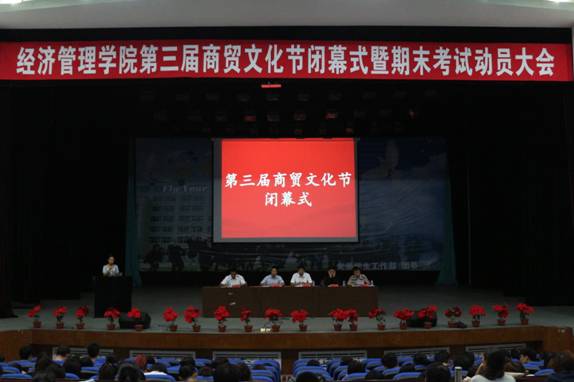 2013年7月3日,我院在大学生活动中心举行了第三届商贸文化节闭幕式暨期末考试动员大会。院长张平,党总支书记孔若东,副院长吴俊江,学生书记曾四龙以及经管学院全体师生出席了此次大会,会议由副院长刘楠主持。