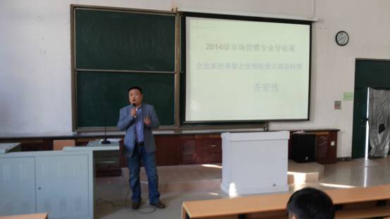 为了帮助市场营销专业新生尽快对所学专业建立起专业概念,尽快适应大学生活并熟悉专业。2014级市场营销专业导论课改变了以往单独一次专题讲座的导论课形式,开设16学时的专业导论课程,分别从专业沿革、职业群介绍、优秀毕业生寄语、教学管理工作、实践教学、学生管理、快消品行业、电子商务行业以及人才培养方案解读等多角度对学生进行介绍,期间除了由专业导论课主讲教师尚德萍讲授外,还聘请了Beat365唯一官方网站院长张平、书记孔若东、教学副院长刘楠、实践教学中心主任于珊珊,企业代表大庆市佳恒经贸有限公司总经理齐宏伟、达内时代科技集团人力资源总监郭坤庆,以及市场营销专业优秀毕业生李志明走进课堂,对2014级新生进行了全方位的大学生活介绍,以及未来职业发展愿景介绍。