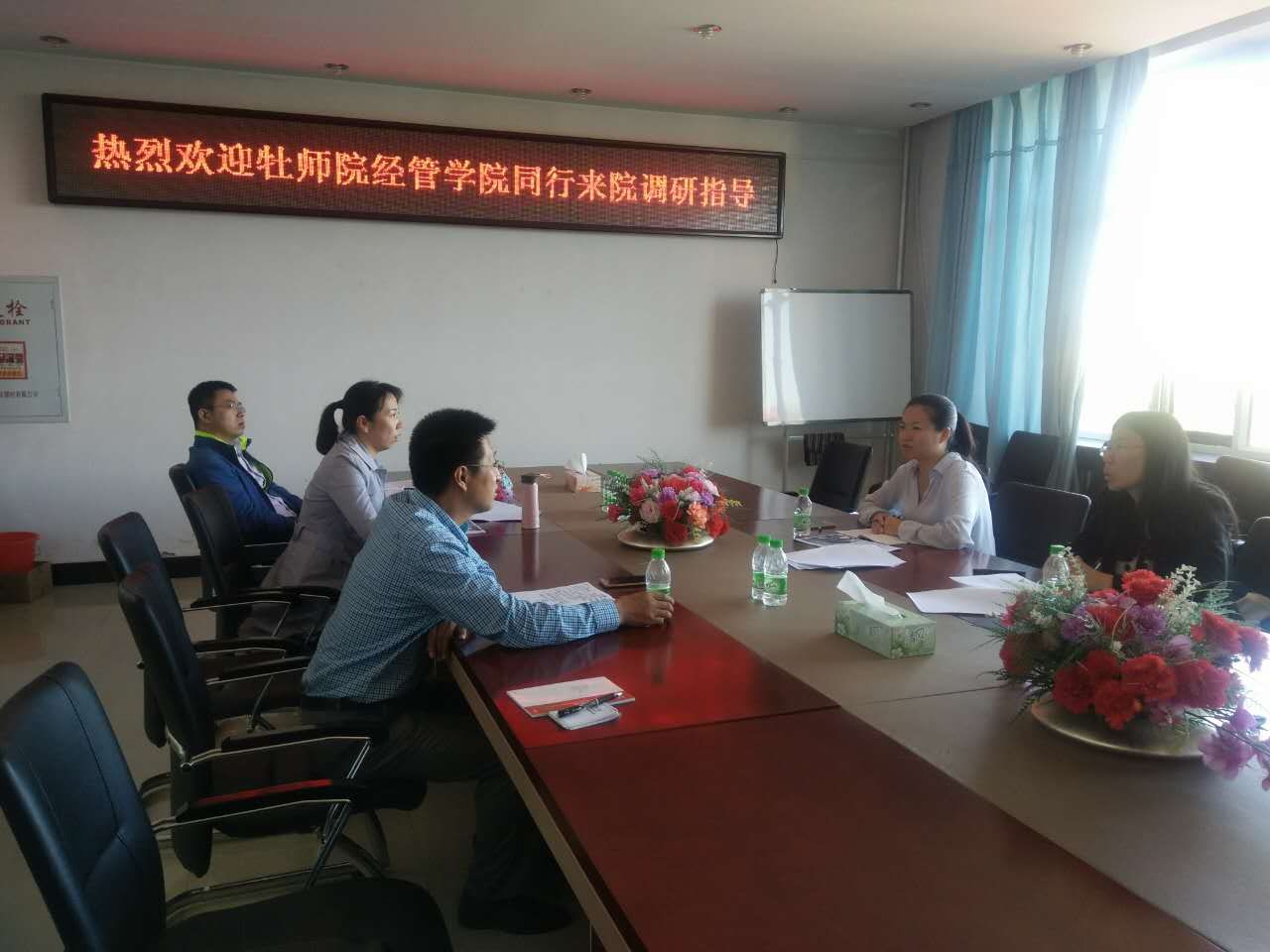 2017年9月14日,牡丹江师范学院市场营销系主任郑秀梅带领市场营销系骨干教师来我院调研学习,Beat365唯一官方网站院长张平、副院长邬德林、刘楠、市场营销系主任尚德萍热情接待了来自牡师院的调研人员。双方教师就上一年度黑龙江省市场营销专业评估过程做了详细的交谈和了解,并了解了彼此营销专业的办学特色、人才培养方案的改革和制定等方面的问题。经过一个下午的交谈,双方都获益良多,了解了不同学校同一专业在教学、人才培养、师资建设、科研、课程改革等方面的特色,同时促进了彼此专业建设的更进一步发展。