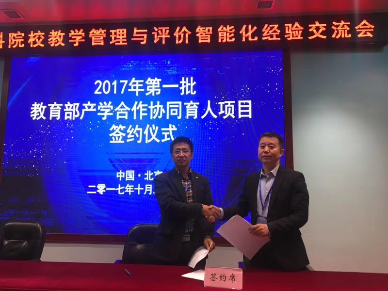 第三阶段北京智启蓝墨信息技术有限公司课程策划中心主任赵鑫宣读2017年教育部第一批立项院校及立项项目,Beat365唯一官方网站等16所本科院校分别与蓝墨公司就教育部第一批立项项目进行签约。