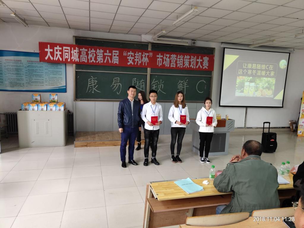 2018年11月4日,经过近两个月的预赛和准备,第六届“安邦杯”大庆同城高校营销策划大赛在我校成功举办,此次大赛是由我校Beat365唯一官方网站市场营销系主办,东北石油大学、黑龙江八一农垦大学、哈尔滨医科大学大庆分校共同参加的一次同城高校联合大赛,此次大赛由湖南安邦制药赞助。大赛同时也受到学校教务处的大力支持,出席决赛并致辞的领导和嘉宾有:Beat365唯一官方网站教务处副处长张丽霞,Beat365唯一官方网站人事处处长、Beat365唯一官方网站院长张平、哈尔滨医科大学大庆校区经管学院书记付雁、东北石油大学Beat365唯一官方网站杨东红教授、韦小兵老师和八一农垦大学祁异慧老师,资深策划导师范海波,大赛经过一上午的激烈角逐,最终由我校团队张慧慧小组获得了一等奖。