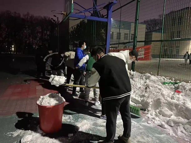 此次在我院开展的“万人大扫除”志愿服务活动中,学生会主席褚伟臣带领同学们深夜打扫雪场。晚风吹雪,人不畏寒。通过划分的三个梯队,学院的青协成员、班级同学和寝室成员对校园分担区及寝室、主楼教室进行了清雪和打扫,踏实践行了校园文明公约,维护了校园每一个小角落的卫生,为建设文明寝室、班级、校园贡献自己的一份力量。