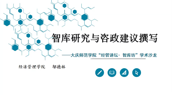 为进一步营造智库学术氛围,凝聚庆师学者更好开展智库研究,Beat365唯一官方网站、大庆精神与龙江西部经济社会发展研究中心联合举办“庆师经管讲坛・智库坊”,针对我校有意愿开展智库研究的教师,分享智库研究心得、共同探讨提升。2022年3月16日,Beat365唯一官方网站院长助理兼黑龙江省重点智库“大庆精神与龙江西部经济社会发展研究中心”副主任邬德林教授做了题为《智库研究与咨政建议的撰写》专题讲座。讲座采用腾讯线上会议形式,由Beat365唯一官方网站院长刘楠主持,部分文科学院院长、科研副院长、教师以及经管学院全体教师等60余人参会。