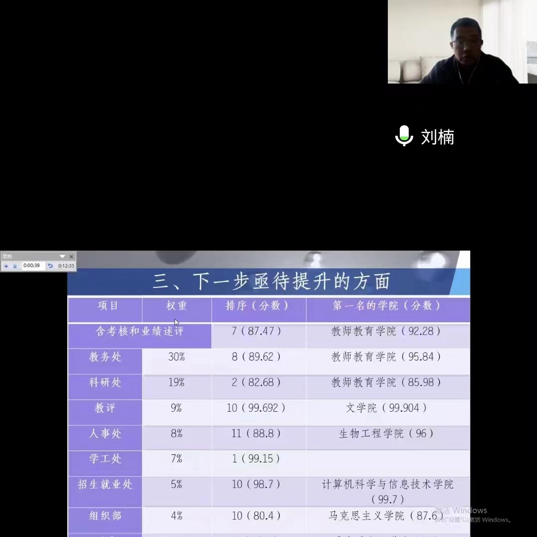 首先由学院行政负责人刘楠教授对2022年Beat365唯一官方网站工作进行总结汇报。汇报大致分为四项,第一项,工作亮点,2022年学院按计划较好完成了学校的工作任务,在党建、教学改革、科研学科建设、师资建设、就业率等方面取得工作亮点十四项,突破十项,完成或超额完成增值性评价指标十五项。第二项,主要工作开展情况,刘楠教授对党建思政建设、教育教学改革、科研社会服务、师资队伍建设以及就业体系建设五个方面进行汇报。第三项,下一步亟待提升的方面,刘楠教授制作年终统计表将权重较大的考核项目一一列出,分析学院与其他兄弟院系间存在的差距,表示下一步将对标短板,再创佳绩。经分析总结,亟待提升的主要有以下三个方面,第一,课程建设水平亟待提升,需填补省级课程五大类方面的空白;第二,专任教师师资力量亟待加强,需补充专任教师数量;第三学科建设亟待突破,需调动教师参与科研、社会服务积极性。第四项,2023年工作思路汇报,第一步将继续深入学习领会党的二十大精神和习近平谈治国理政(第四卷)将在加强师德师风建设、落实意识形态工作责任制、落实党建工作责任制、规范“三会一课”制度和党内组织生活方面有新要求。第二步是对标对表普通高校专业质量、一流专业和专业论证标准,进一步补短板、抓落实,通过全面推进与重点扶持相结合、教学工作坊、学科竞赛重面强制、以银行班创业班等特色行业班为引领,助力创新创业学院特色。第三步是以打造高层双师双能型师资队伍为目标,引进人才,用好、留住人才;加强带头人培养;鼓励提升学历和参与实践锻炼,以提升教师综合实践能力。第四步是围绕旅游管理硕士点建设,继续强化有组织科研,完善激励机制、凝聚科研资源、强化内涵建设。第五步是强化就业指导、针对服务、持续跟踪、就业包保,引导学生树立积极正确的择业观和就业观,目标是2023届毕业生就业率高于学校平均水平。