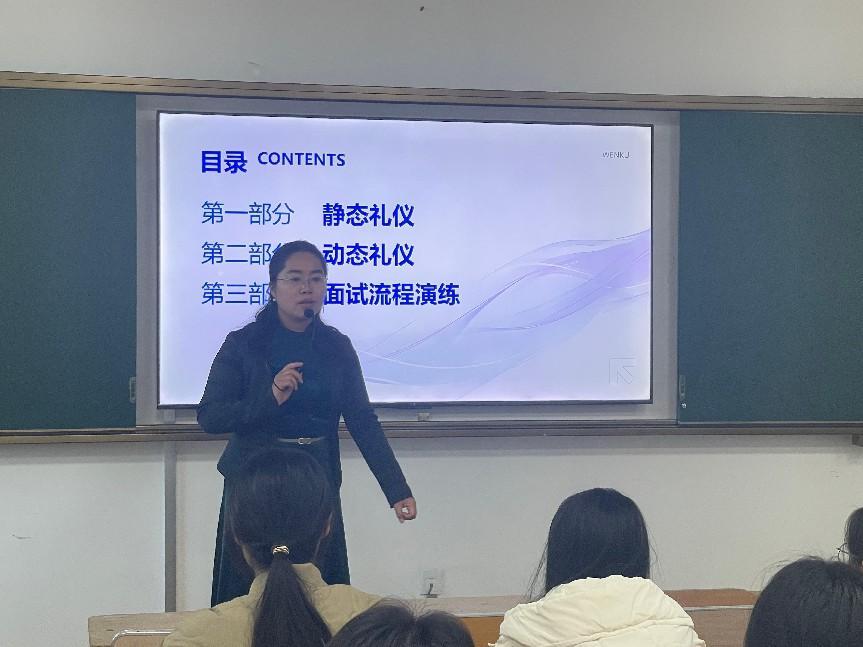 课程围绕“静态礼仪”“动态礼仪”和“面试流程演练”三部分展开。秦冬梅老师首先为同学们阐述了礼仪对面试结果的重要影响,并以面试基本流程为切入点,从敲门、走姿、站姿、鞠躬、问候、坐姿、表情、退场等若干环节,为同学们讲解了动态礼仪规范。