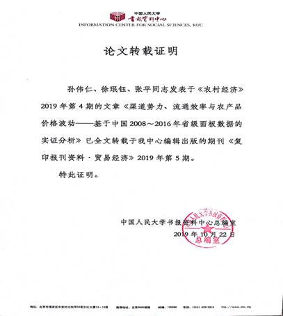 近日,我院教师孙伟仁、徐珉钰、张平发表于《农村经济》2019年第4期的学术论文《渠道势力、流通效率与农产品价格波动——基于中国2008-2016年省级面板数据的实证分析》被中国人民大学书报资料中心复印报刊资料《贸易经济》2019年第5期全文转载。