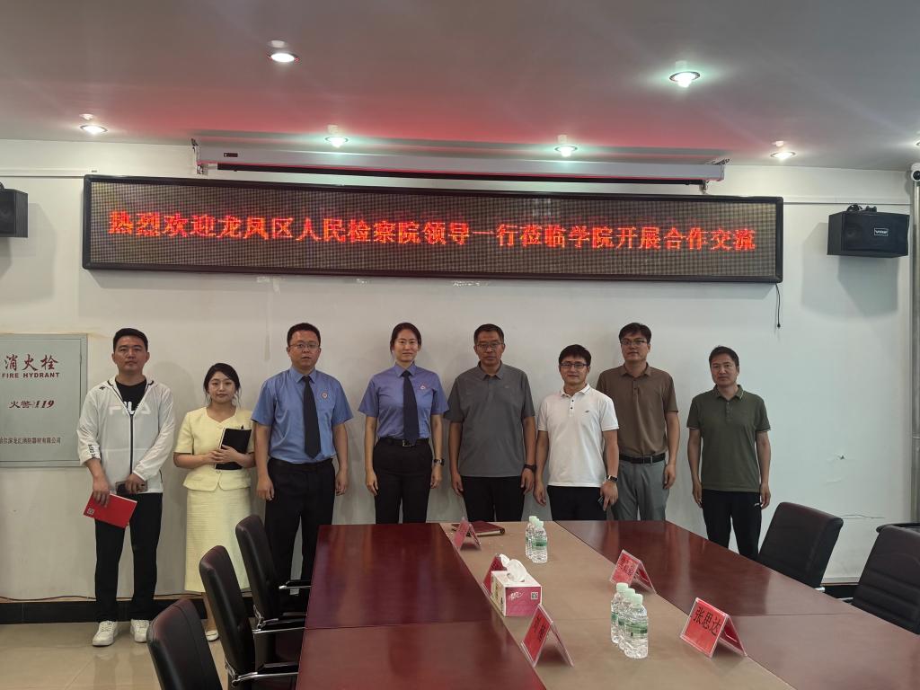 7月2日,大庆市龙凤区人民检察院党组副书记张思达,检察官王旭东、朱纹、常石嘉一行莅临Beat365唯一官方网站,双方于学院会议室展开深入合作交流。Beat365唯一官方网站院长刘楠,副院长孙伟仁,骨干教师葛法权、韦建华出席此次会议。