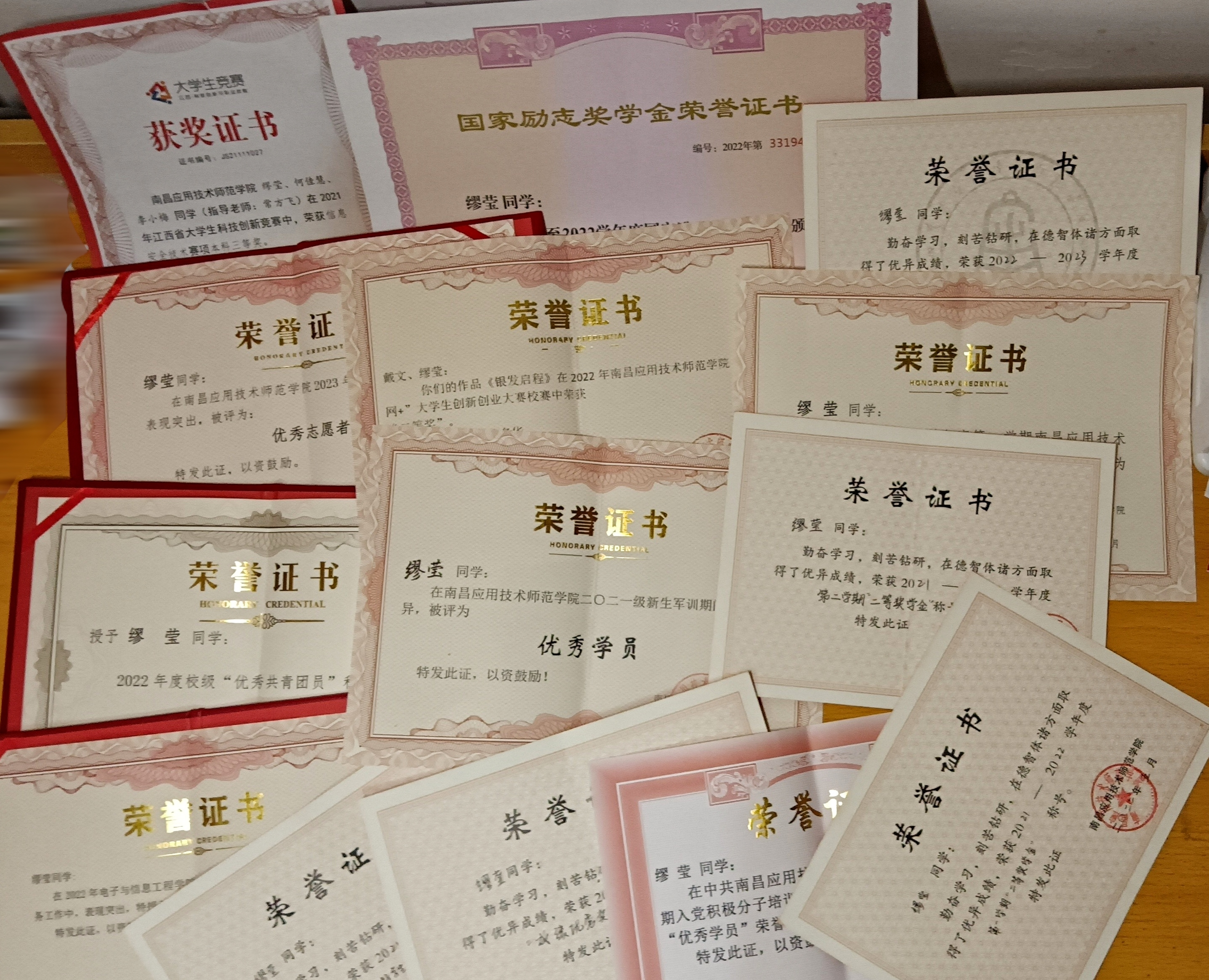 作为一名学生,她深知学习的重要性,她态度端正,认真勤奋,获得了老师的一致认可。“知识是人类进步的阶梯”,在学习上她一直严格要求自己,刻苦努力。她合理安排时间,充分利用学习资源,通过努力她的学习成绩排在班级前列,曾获得校二等奖学金两次、校三等奖学金两次、国家励志奖学金两次、三好学生、优秀共青团员、优秀学生干部、防疫优秀志愿者、江西省信息安全技术赛项本科三等奖、互联网+创新创业校赛二等奖。