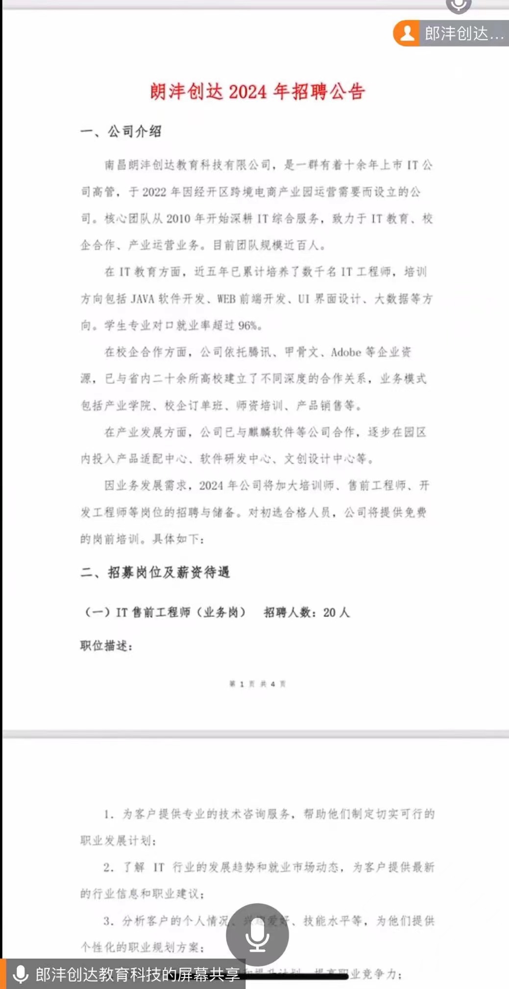 为进一步完善人才培养体系,搭建学校与企业之间的交流平台,抓住考研后促就业工作关键期,帮助有求职意愿的毕业生与用人单位加强对接,促进2024届毕业生高质量充分就业。;于1月10日晚上7点350vip浦京集团官网联合朗沣创达教育科技有限公司、南昌同兴达精密光电有限公司、江西省博信玻璃有限公司采用线上宣讲招聘形式,为2024届毕业生开展线上专场招聘。学院党总支书记兼执行院长江建华、2024届毕业生全体辅导员、全体毕业生参加了本次线上招聘会,会议由就业负责人曾思雨主持。