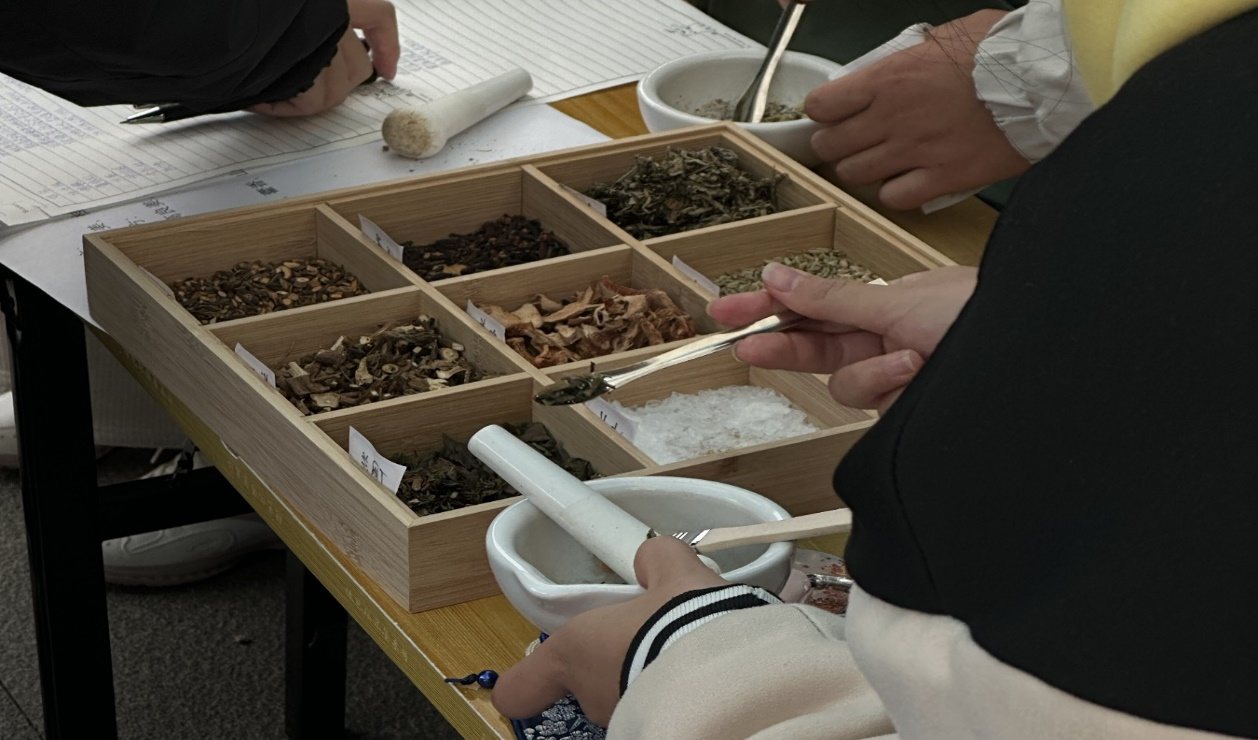 “红罗复斗帐,四角锤香囊”。活动现场,工作人员放置好各种香料,如佩兰、藿香、丁香、冰片等中药香料,为同学们准备的香囊包各个都小巧精致透露着深深的文化底蕴,并贴心为同学们准备了不同功效香囊的配方。在活动现场,同学们有序排队制作香囊,从选择香料,进行研磨,填充香料,每一个步骤都十分认真,工作人员也及时提供帮助,由同学们亲手制作的香囊通过巧妙的搭配,香气扑鼻而来,弥漫在空气中,同时更是传递了同学们的美好祝福,活动现场气氛十分融洽。