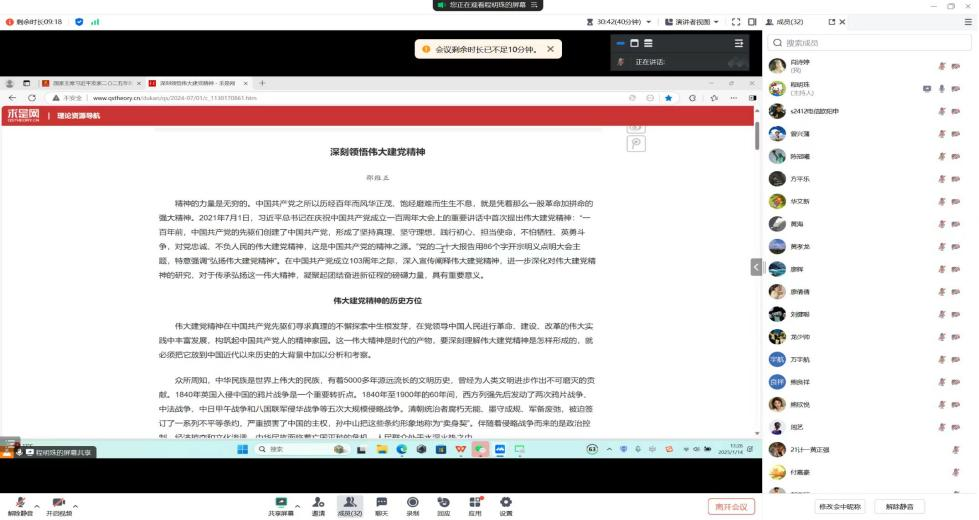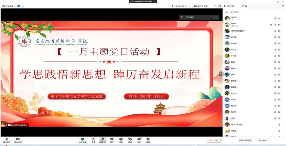 为持续深入学习贯彻习近平新时代中国特色社会主义思想,弘扬伟大建党精神,使全体党员更加自觉地学习党章、遵守党章、贯彻党章、维护党章,350vip浦京集团官网第二党支部于2025年1月14日,在腾讯会议组织召开了“学思践悟新思想 踔厉奋发启新程”主题党日活动。支部全体党员参加了此次会议,会议由党支部书记程明珠主持。