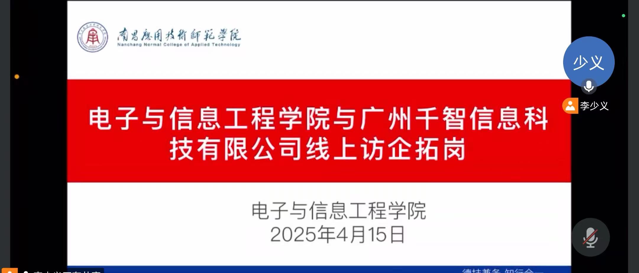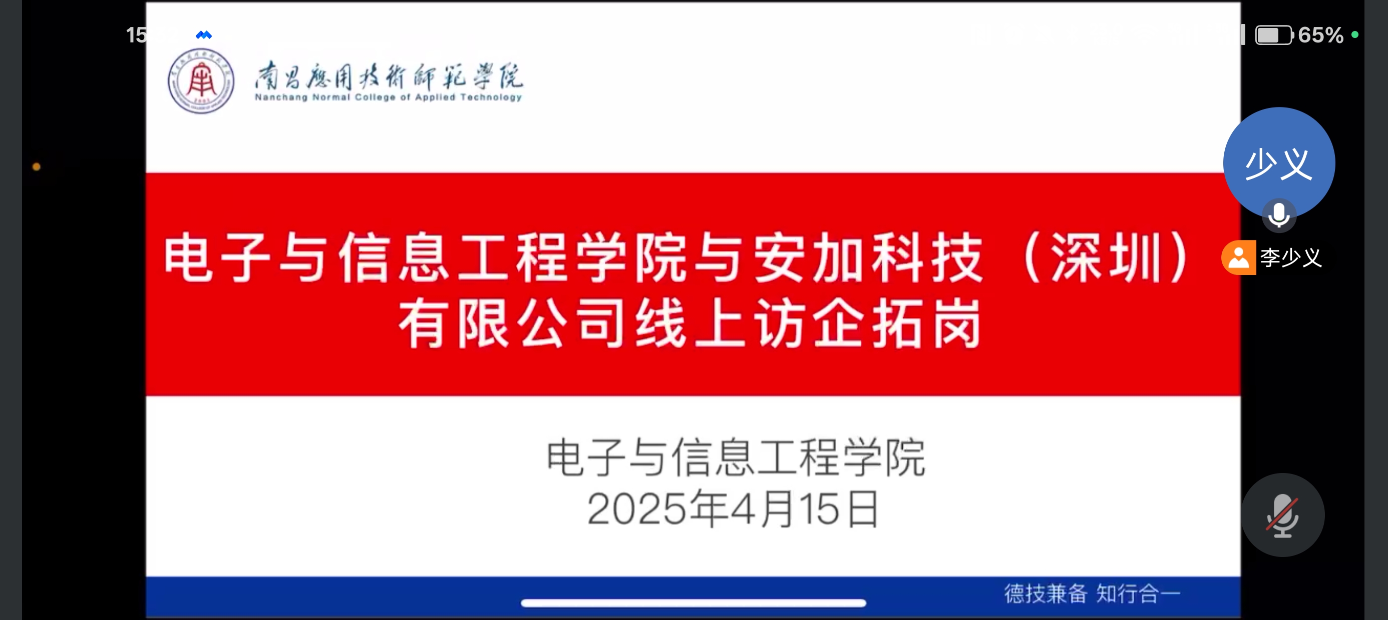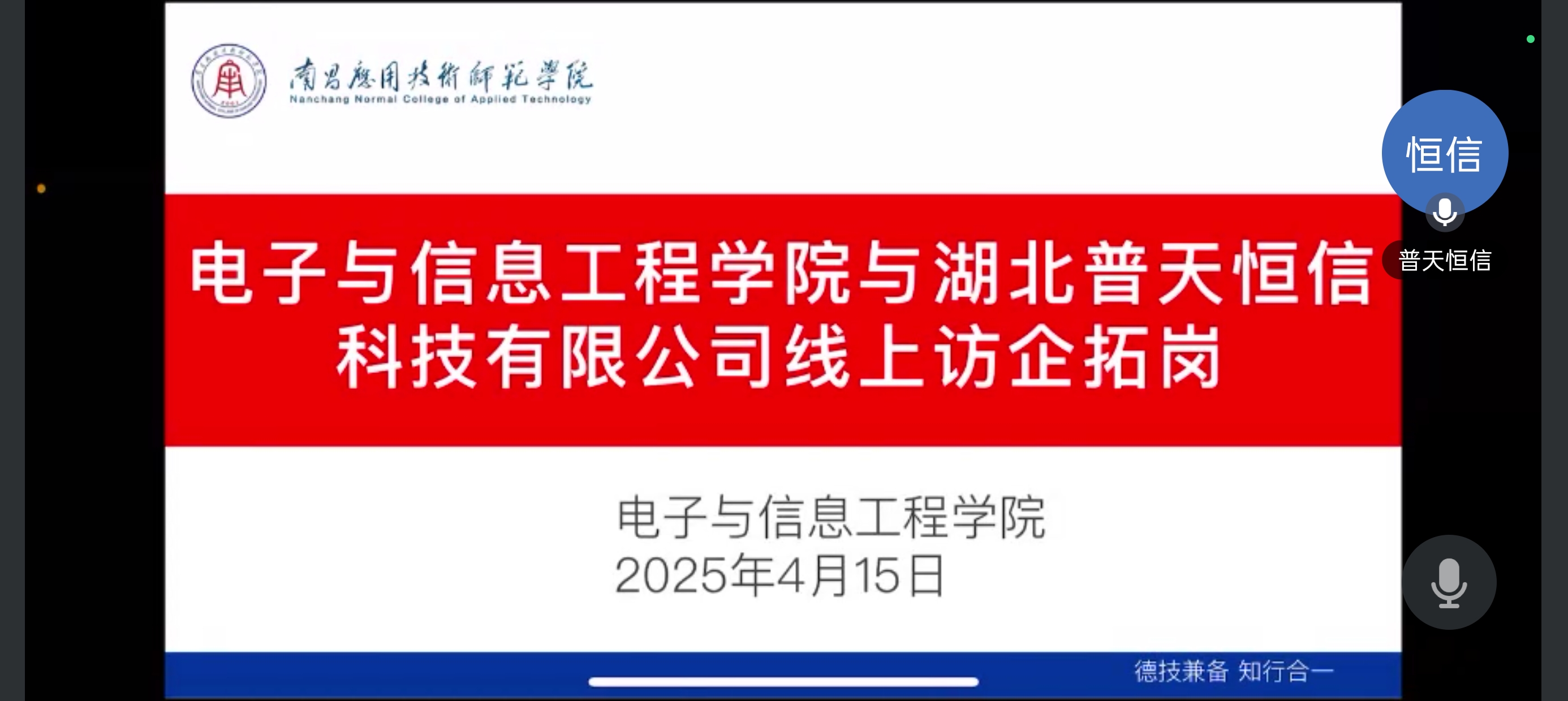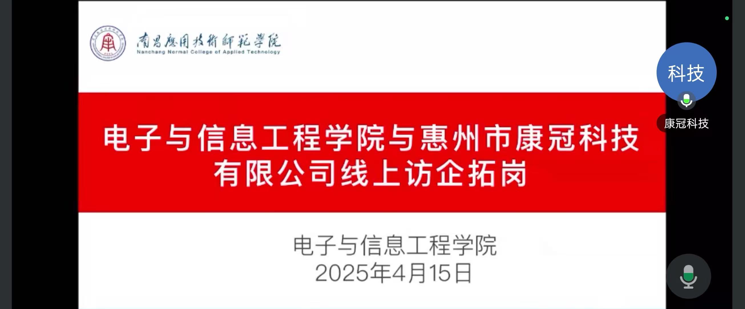 为深化校企合作,拓宽学生就业渠道,提升人才培养质量,4月15日下午,350vip浦京集团官网邀请惠州市康冠科技有限公司、安加科技(深圳)有限公司、湖北普天恒信科技有限公司、广州千智信息科技有限公司等多家公司开展线上访企拓岗行动,学院党总支书记江建华及校长助理李少义出席会议,会议由就业专员曾思雨主持。