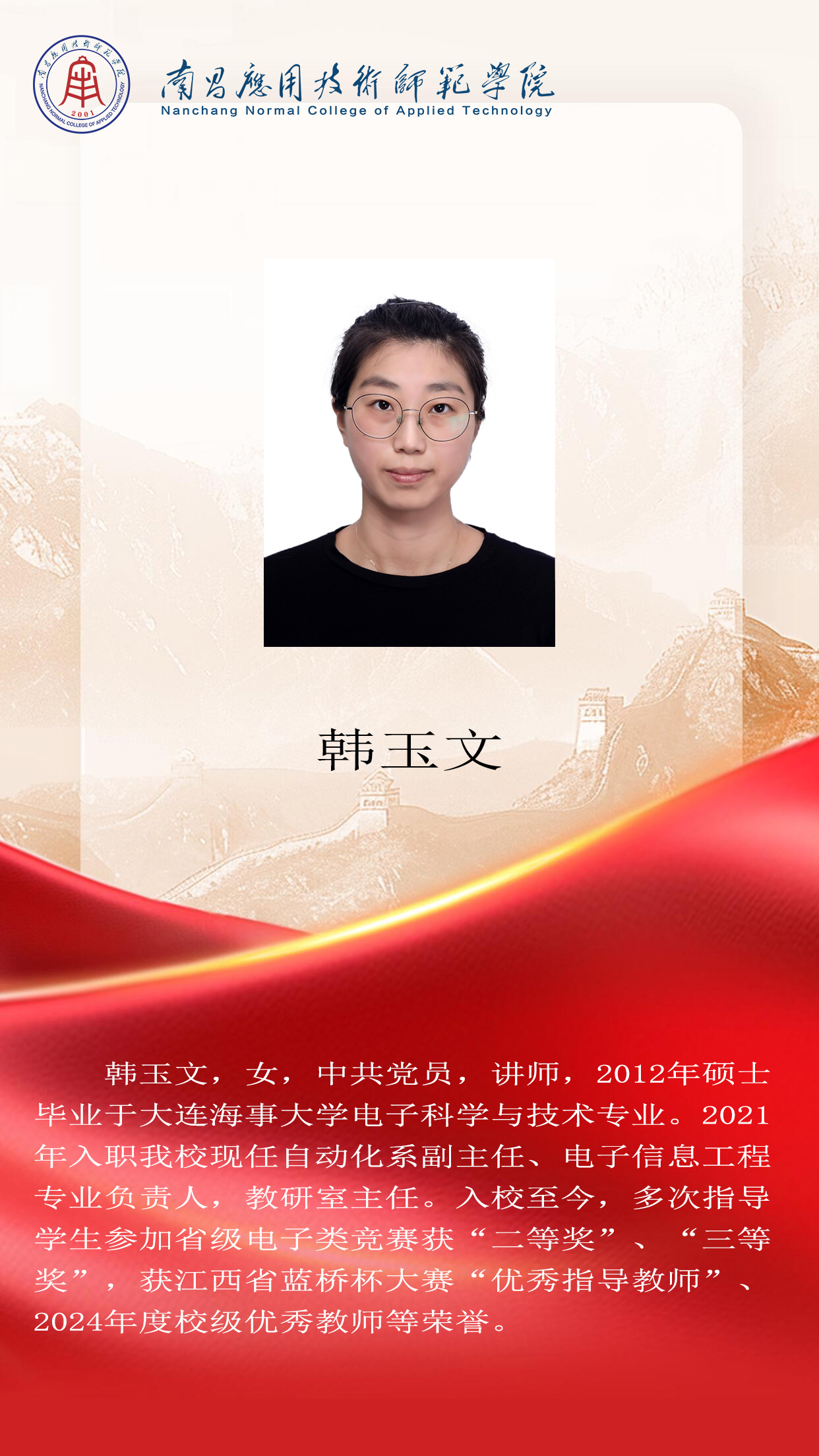 先进典型 优秀毕业生 优秀学生风采 优秀教职工 您现在的位置是:首页 > 先进典型 > 优秀教职工 韩文玉 优秀教师 管理员2025-06-16646 上一篇 曹璐 计算机系主任 下一篇 张扬 工程技术系主任