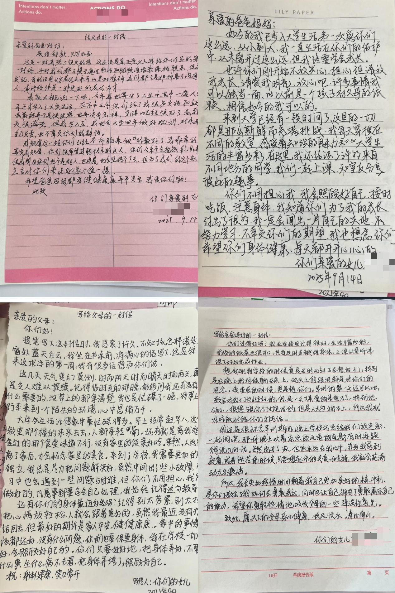 为引导学生在快节奏的数字时代重拾笔墨温情,深化自我认知、感恩意识与情感联结,浦京集团官网精心策划并举办了 “写给父母的一封信”“写给自己的一封信”“写给重要的人的一封信” 三合一主题书信创作活动。活动自启动以来,获得了大部分学生的积极响应,字里行间满含新生对大学的期待、对情感的珍视与对自我的期许,成为学院助力新生适应校园生活的温暖注脚。
