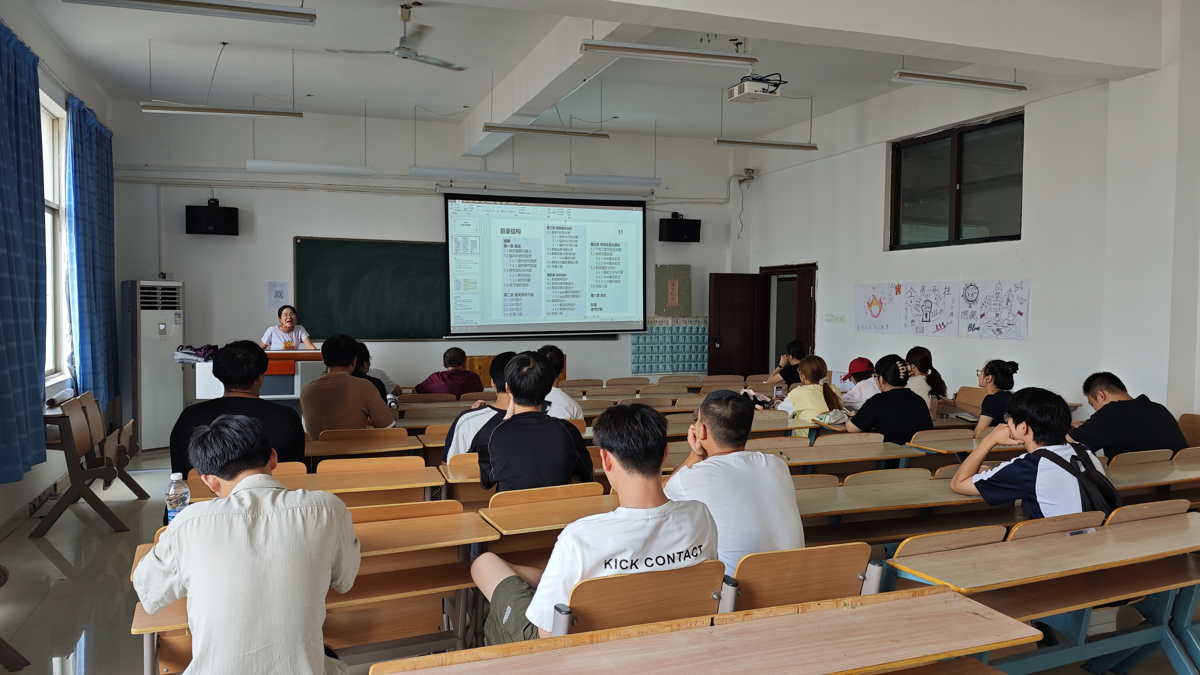 随后指导教师就自己的研究方向、指导的课题领域以及对学生的期望进行了详细介绍。丁艳艳老师通过PPT展示,向同学们明确了从开题、中期检查、论文撰写到最终答辩的各个关键时间节点。强调了学术道德与学术规范,要求同学们坚守诚信底线,独立完成自己的毕业答卷。