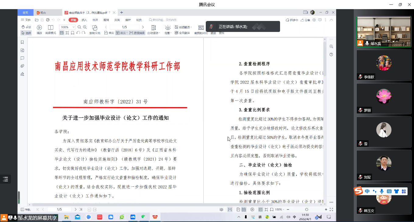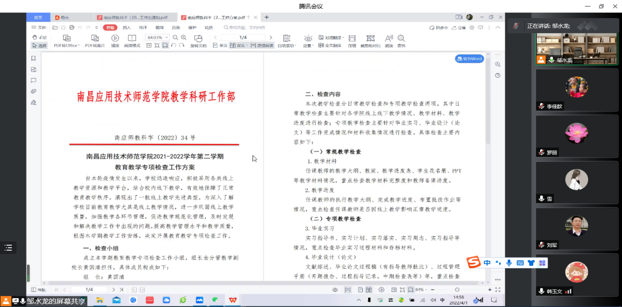 4月1日,350vip浦京集团官网利用腾讯会议,线上召开教研室工作会,教务管理人员、教研室主任参加了此次会议,会议由院长邹水龙主持。