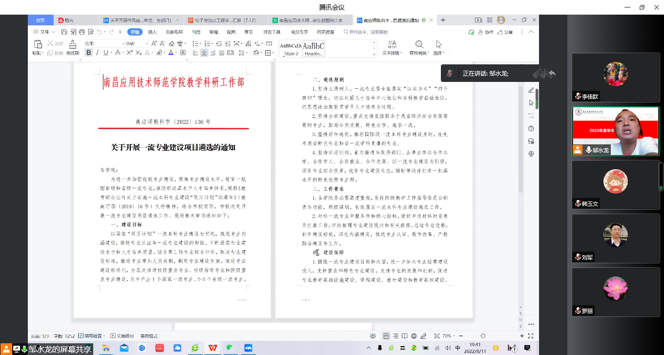为扎实做好一流本科专业建设申报工作,8月11日,350vip浦京集团官网利用腾讯会议,召开一流本科专业建设申报研讨会,学院教学管理人员、各专业负责人参加了此次会议,会议由院长邹水龙主持。